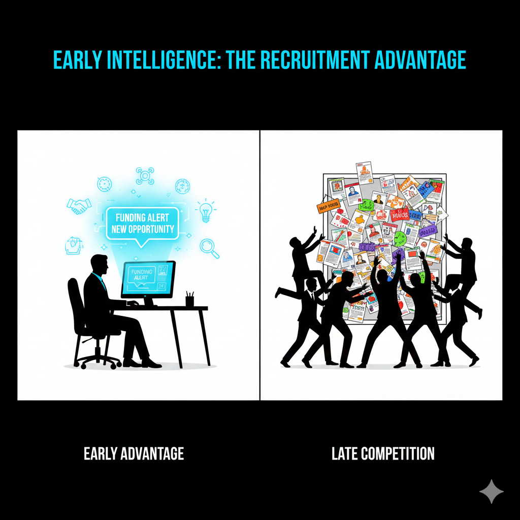 For recruitment agencies, funding signals represent a Predictive Window of 20–30 days where you can engage decision-makers before they are overwhelmed by reactive applications. While traditional agencies wait for a LinkedIn post to trigger an outreach, Recruit Signals users leverage these capital events to position themselves as strategic partners.